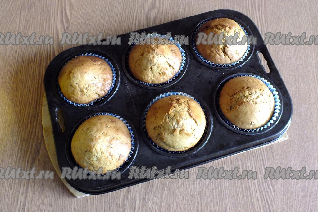 Через указанное время проверьте готовность выпечки деревянной шпажкой (при прокалывании теста готовых кексов шпажка останется сухой). Переложите готовые кексы на тарелку и охладите.