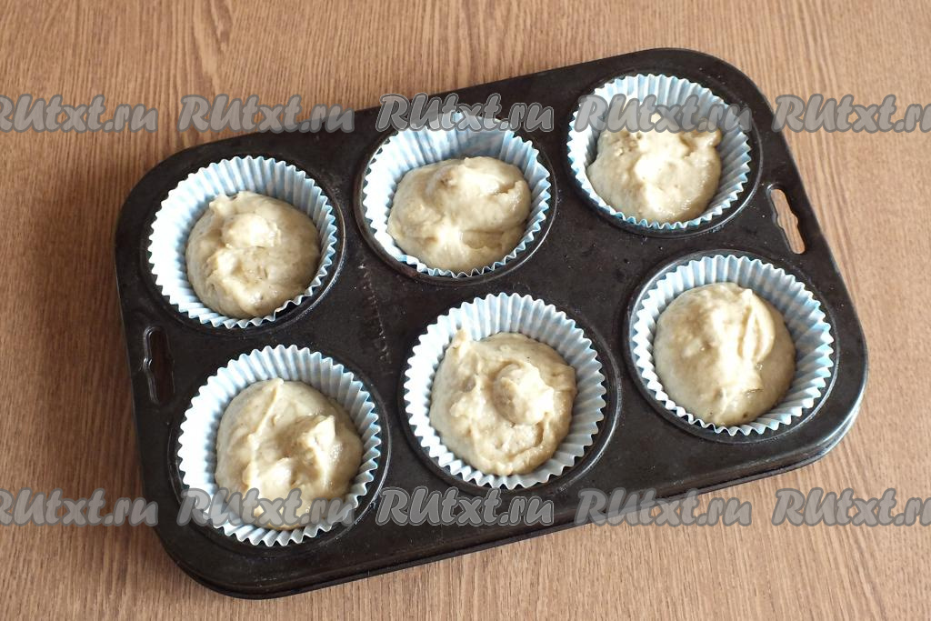 В форму для кексов, по желанию, вложите бумажные вкладыши. В них выложите по столовой ложке с горкой теста (формочки для кексов должны быть заполнены тестом на половину объёма). Поставьте выпекаться кексы с халвой в разогретую до 180 градусов духовку на 20 минут. Учитывайте особенности своей духовки!
