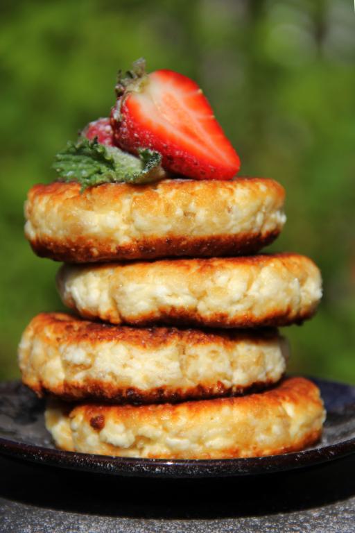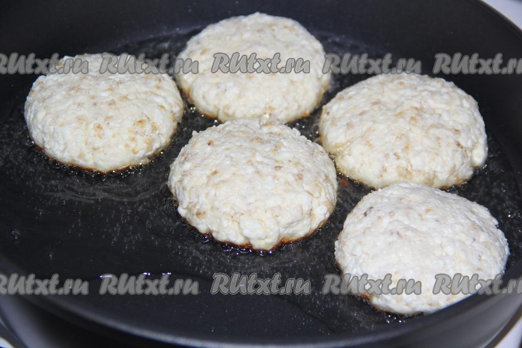 Жарить творожно-овсяные сырники до золотистого цвета с двух сторон на среднем огне.