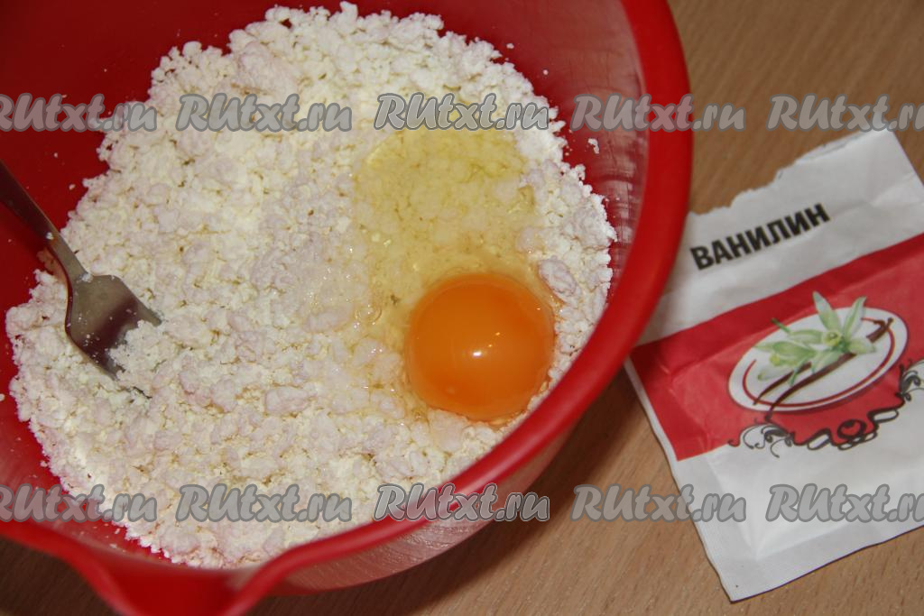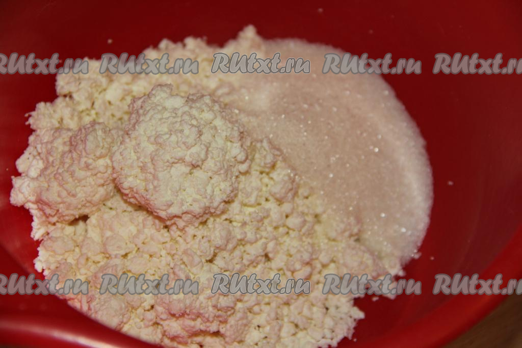 Соединить творог и сахар, по желанию, можно всыпать щепотку ванилина, а затем перемешать вилкой. Творог можно использовать любой жирности.