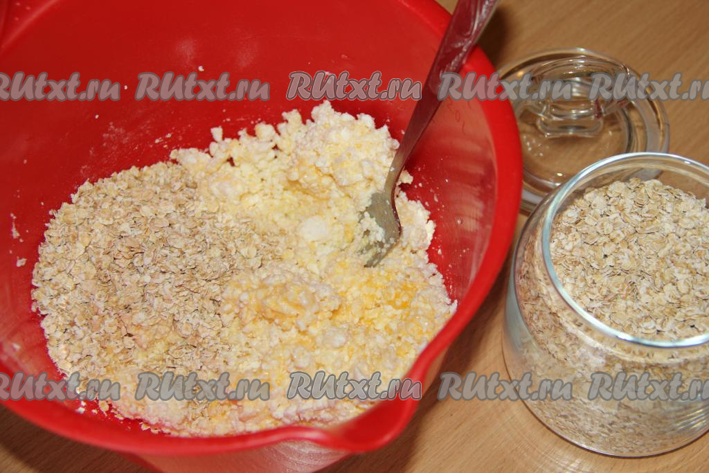 Хорошо перемешать ещё раз, творожно-овсяная масса получится густой, она будет хорошо держать форму при формировании сырников.