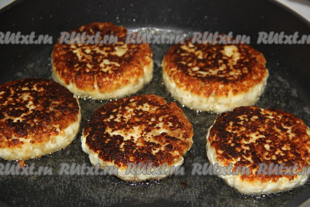 Сформировать круглые сырники и выложить их на сковороду, хорошо разогретую с растительным маслом.