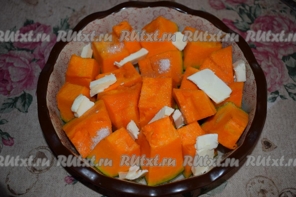 В форму (я взяла керамическую) выкладываем тыкву, посыпаем её сахаром и раскладываем между кусочками тыквы сливочное масло, нарезанное на пластины.
