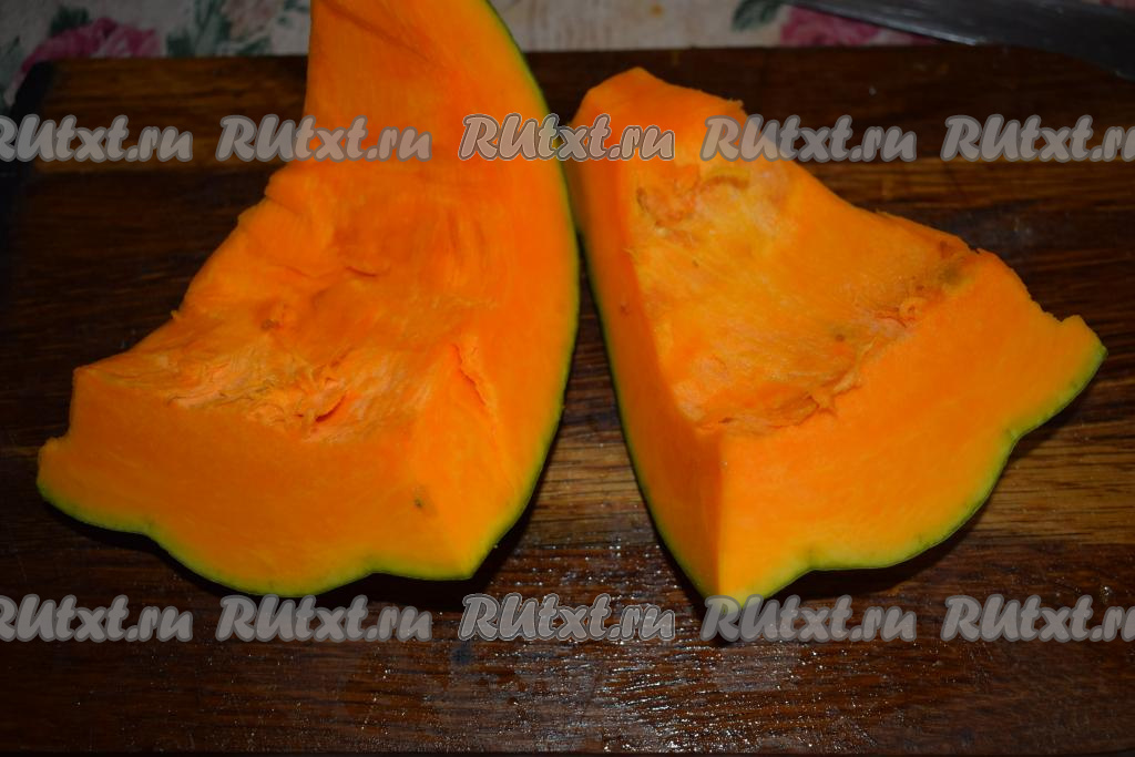 Для начала отрежем кусок нужного размера от тыквы и очистим его от семян и волокон.
