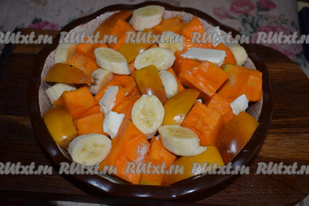 Далее в пустоты между кусочками тыквы раскладываем хурму и банан. Посыпаем десерт ванильным сахаром и вливаем воду.