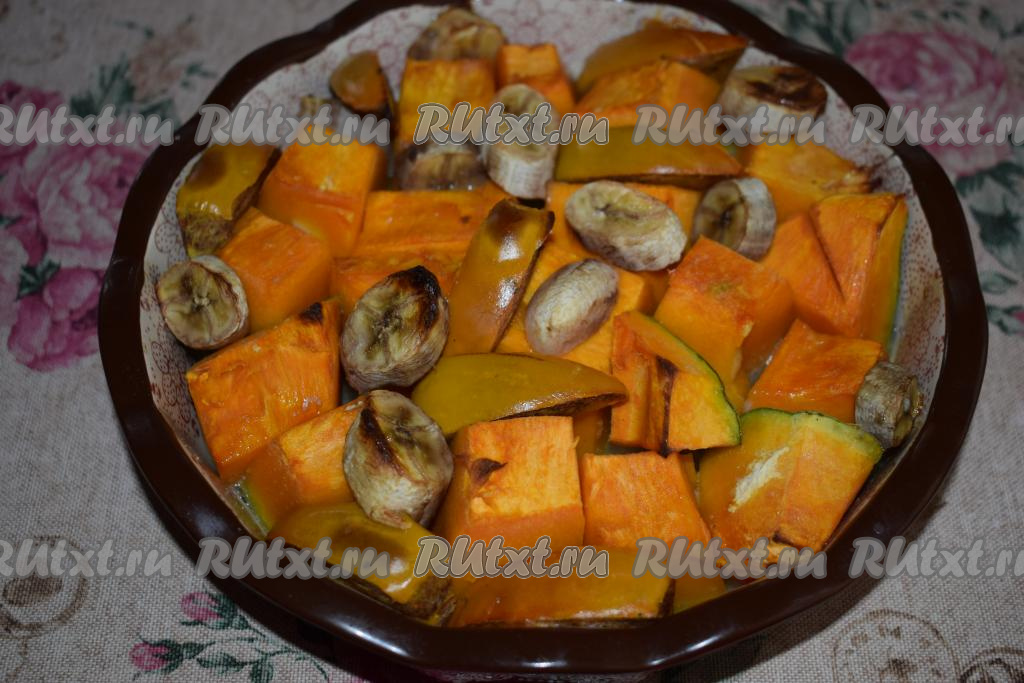 Переворачиваем кусочки тыквы, хурмы и банана на другую сторону. Поливаем тыкву и фрукты сиропом, образовавшимся внутри формы, и отправляем в духовку ещё на 20 минут, температуру делаем 180 градусов.