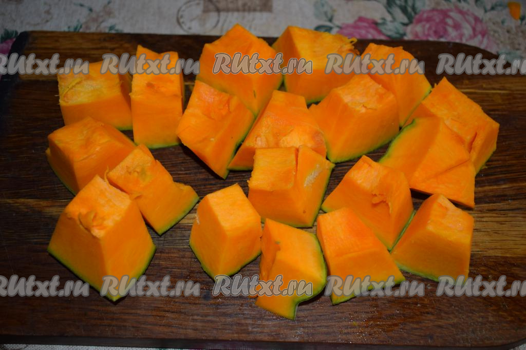 Далее нарежем тыкву на кусочки (я буду готовить тыкву с кожурой, вы же можете её очистить - это дело вкуса).