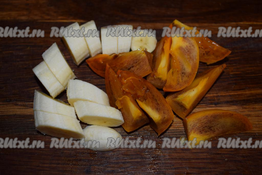 Нарезаем хурму и банан на кусочки.