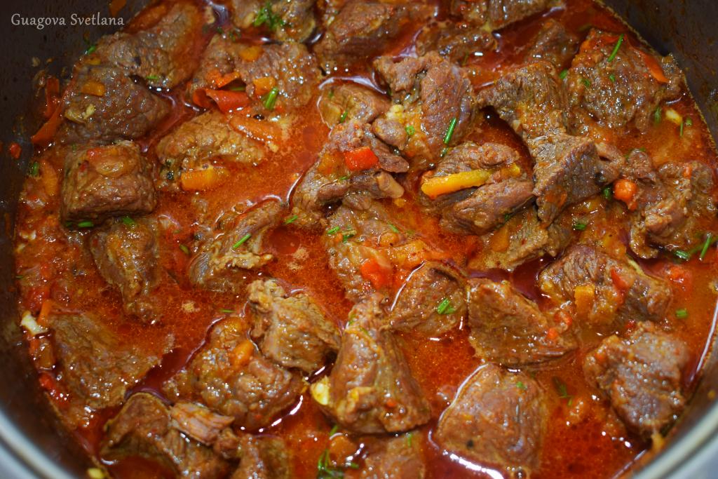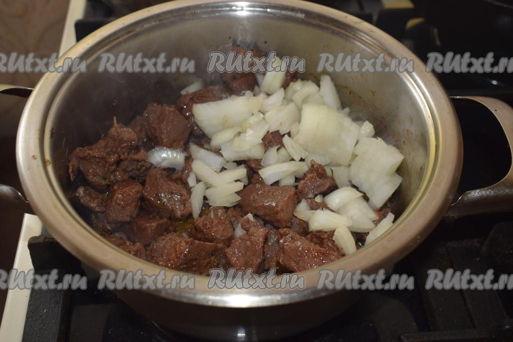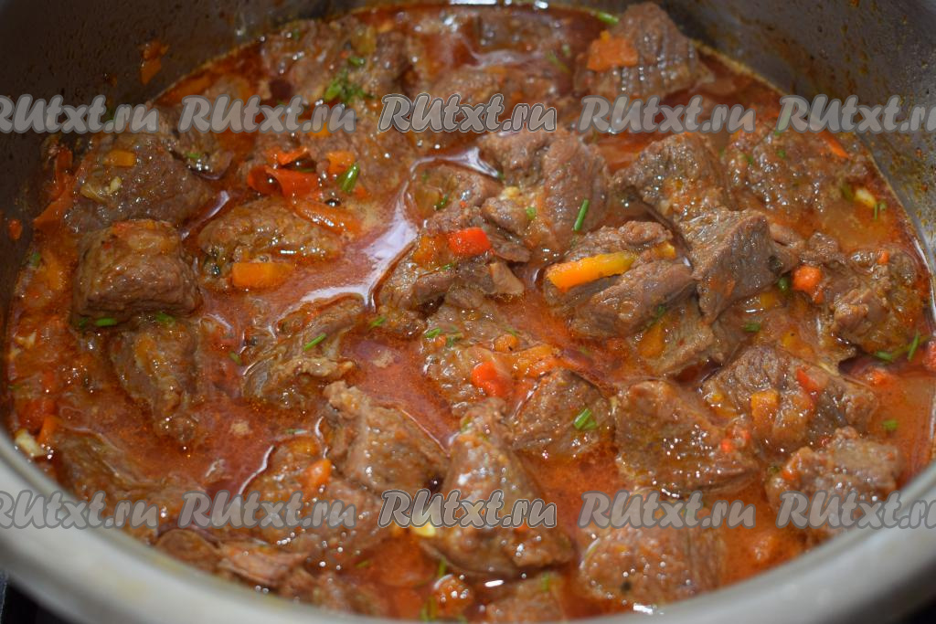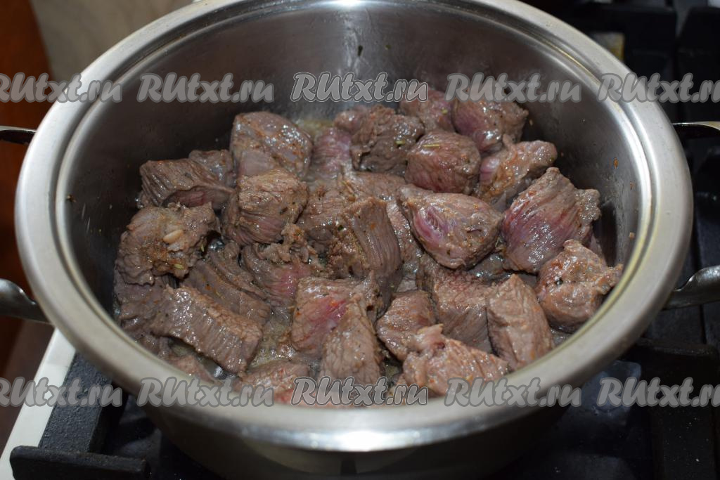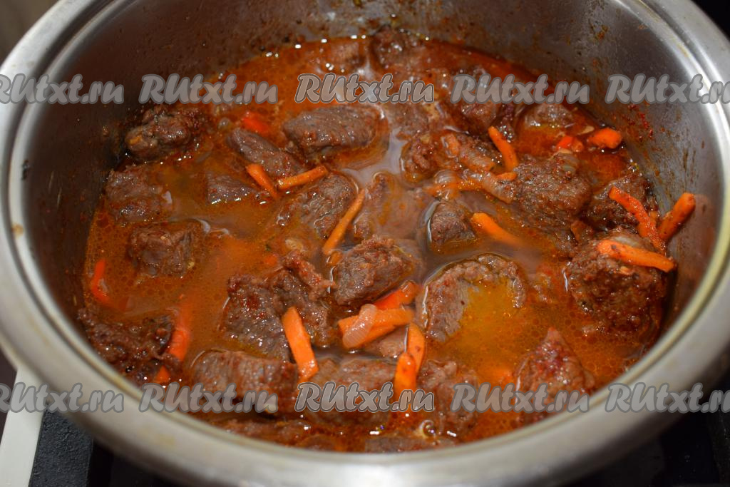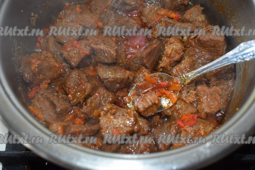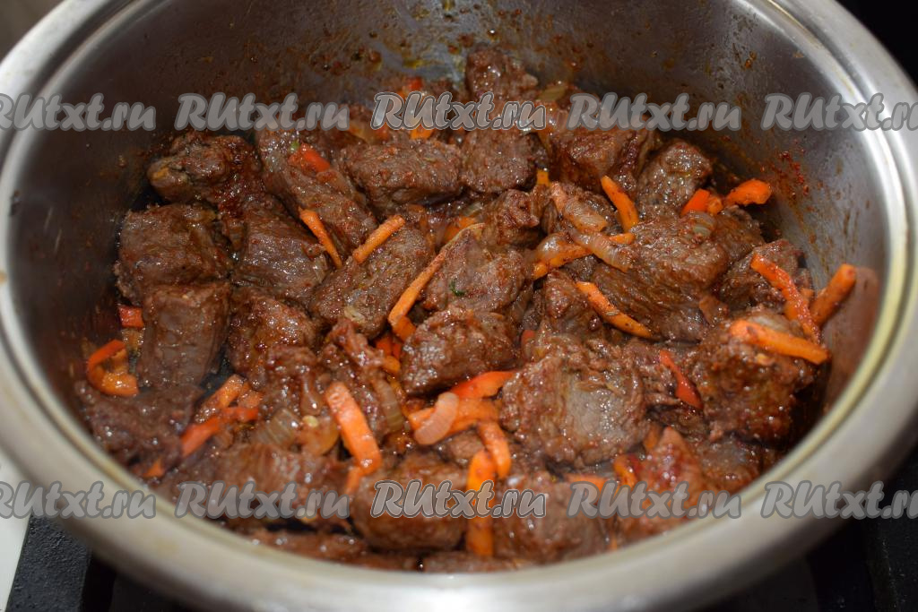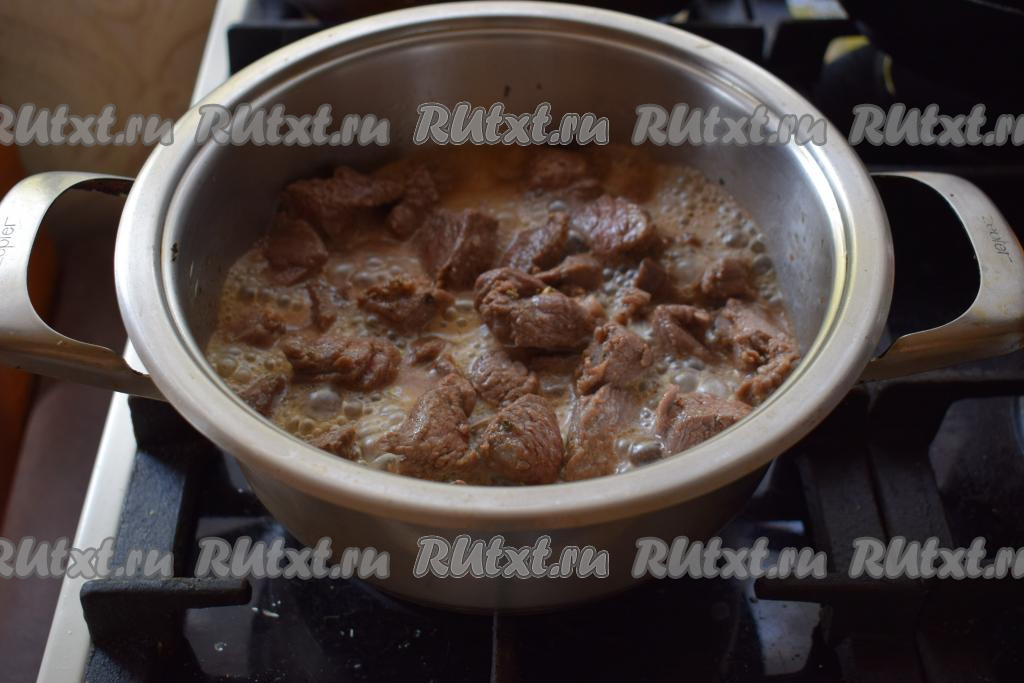 В это время из говядины будет выделяться сок и она будет медленно кипеть в собственном соку. Томим мясо до того момента, пока вся жидкость не выпарится.