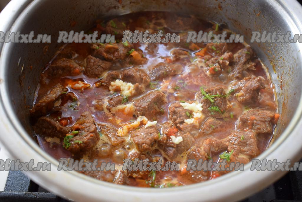 Вливаем ещё немного воды, если жидкость во время тушения выпарилась. Добавляем очищенный чеснок, пропущенный через пресс, и посыпаем блюдо зеленью. Даём говядине с овощами закипеть.