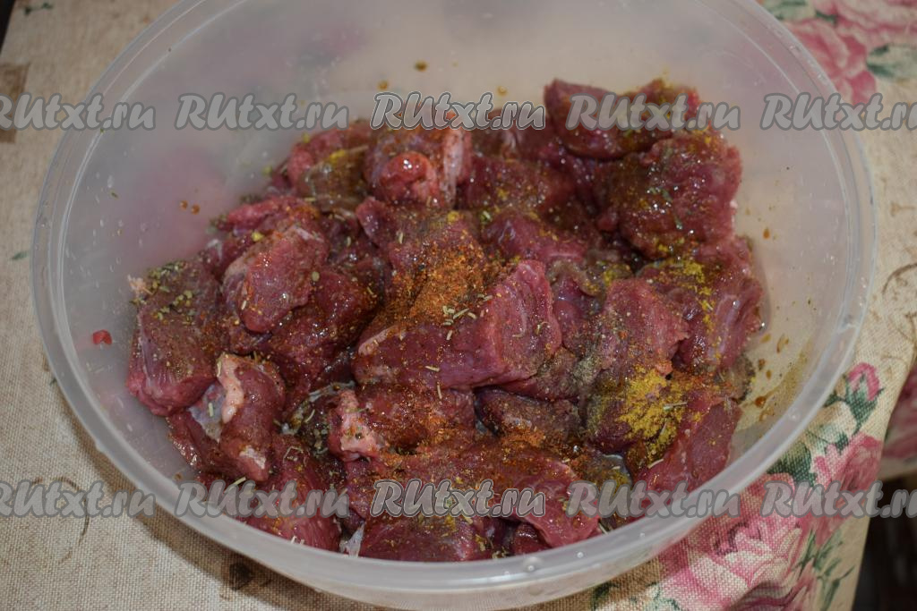 К кусочкам говядины добавляем соль, чёрный молотый перец и специи, которые вы любите (у меня это: сухая аджика, розмарин, базилик и карри). Вливаем к мясу соевый соус и хорошо перемешиваем. Накрываем миску крышкой и оставляем в тёплом месте, пусть мясо постоит и промаринуется, примерно, 20 минут.
