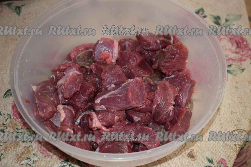 Говядину промываем под проточной водой и обсушиваем. Нарезаем мясо на порционные кусочки размером, примерно, 3 см на 4 см. Складываем нарезанное мясо в миску.