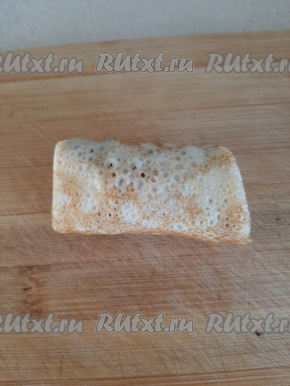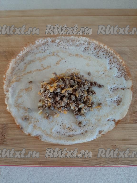 Выкладываем по 1 столовой ложке ливерной начинки на блинчик. Подворачиваем края блина на начинку с двух сторон, а затем сворачиваем блинчик рулетиком.