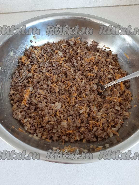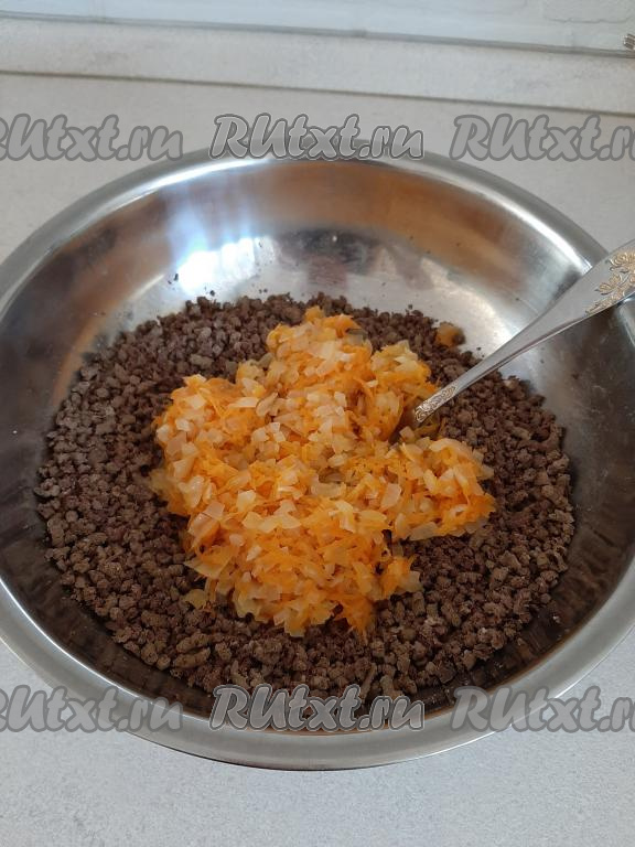 Добавляем к луку натёртую морковку и обжариваем, накрыв крышкой, примерно, 5 минут (овощи должны стать мягкими, они не должны хрустеть). Можно для сочности добавить 30 миллилитров кипячёной воды, подсолить по вкусу.