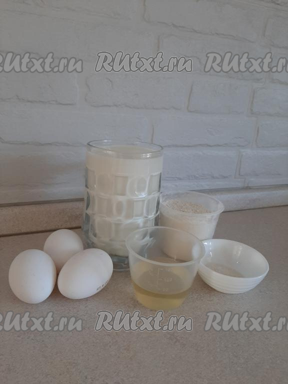 Подогреваем в микроволновке на самой большой мощности в течение 1 минуты 500 миллилитров молока. Выливаем молоко в миску, добавляем 3 яйца, 60 мл подсолнечного масла, щепотку соли, 1 чайную ложку сахара и 175 грамм муки.