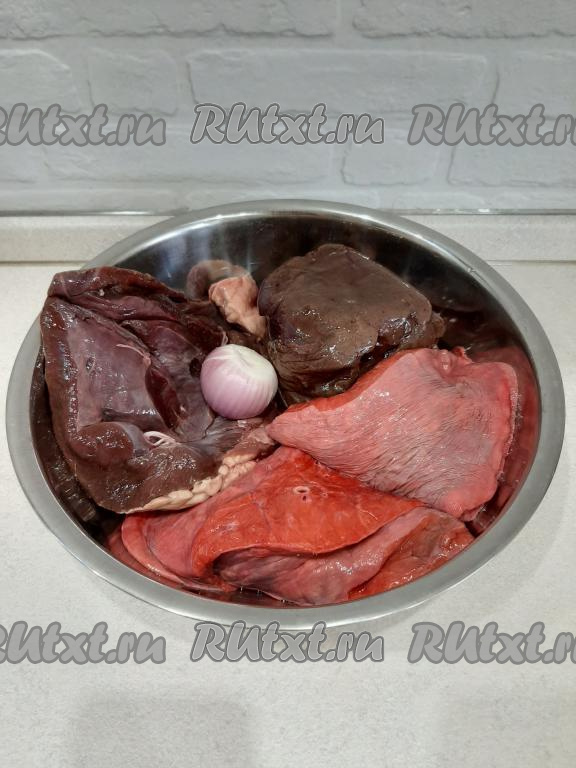 Сначала займёмся приготовлением нашей начинки. Нужно вымыть хорошо субпродукты (я взяла говяжьи лёгкое, печень и сердце) и очистить одну луковицу.