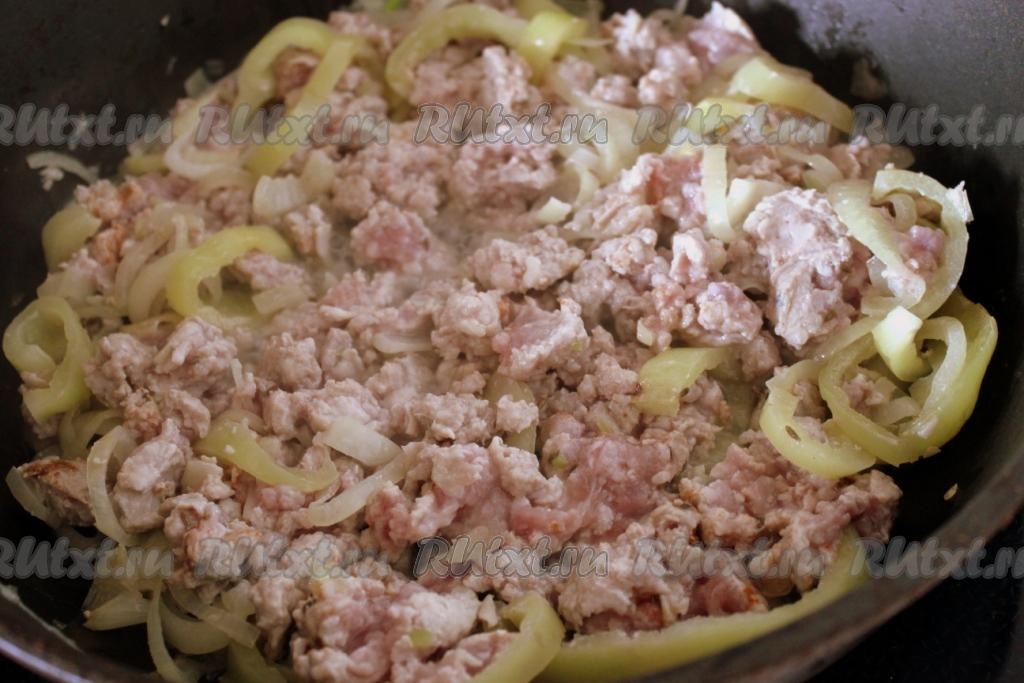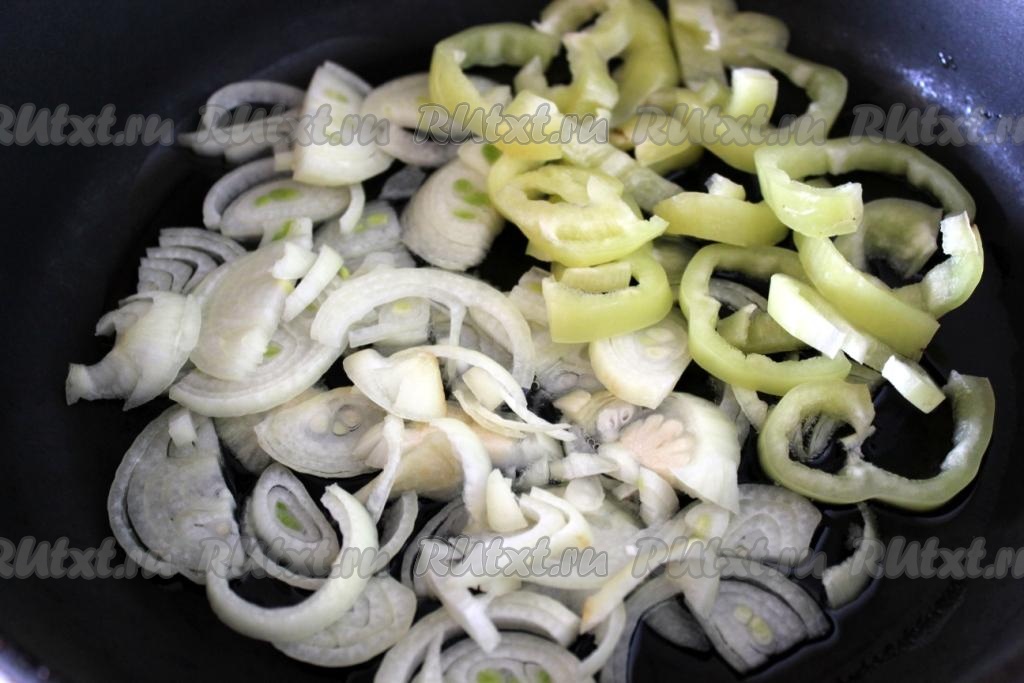 Сначала быстро обжарьте на растительном масле нашинкованный лук и нарезанный полосками болгарский перец.