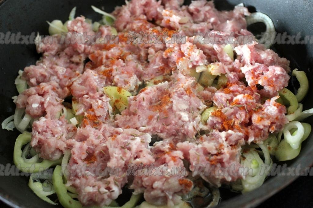 Добавьте фарш и специи, посолите и обжарьте всё вместе на сильном огне минут 15.