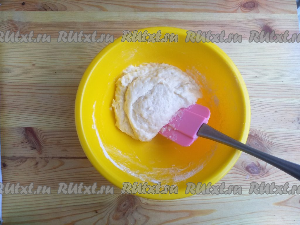 После того как масса начнёт собираться в комок, выложить её на твёрдую поверхность, присыпанную мукой, и продолжить замес руками. Постепенно увеличивая нажим и добавляя оставшуюся муку, вымесить тесто. Оно должно быть не липким и мягким, как мочка уха. Тесто завернуть в пищевой пакет и оставить на 30 минут в холодильнике.