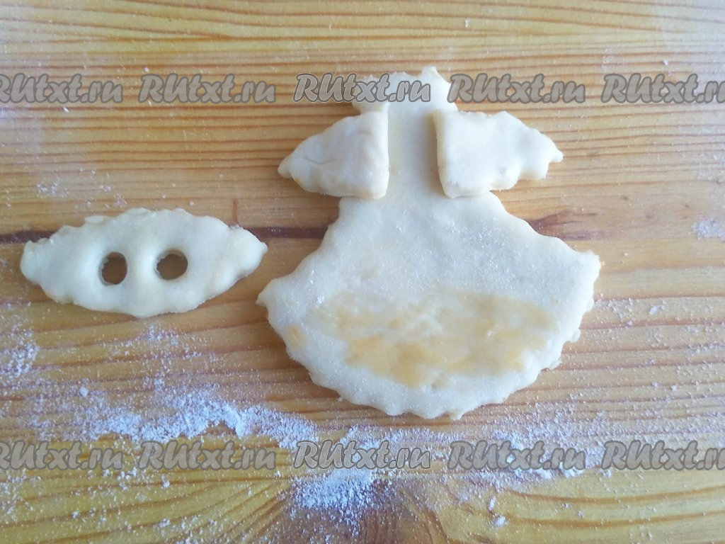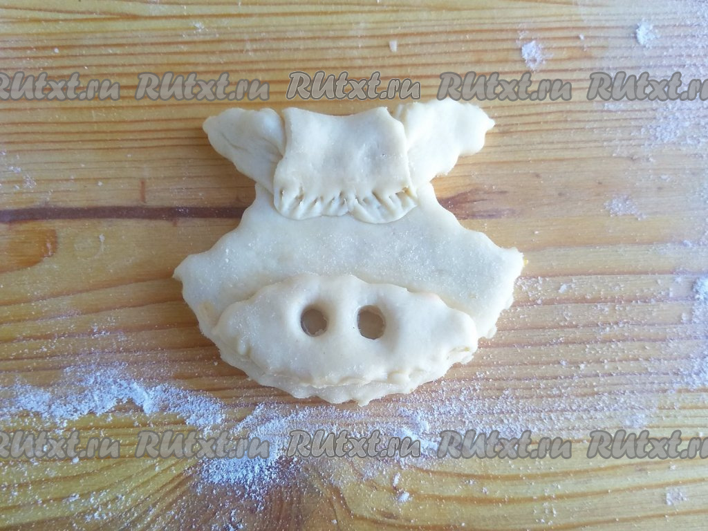 Места соединения смазать взбитым яйцом. Выложить подготовленные ушки и нос.