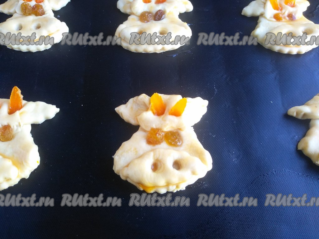 Заготовки печенья "Бычки" смазать взбитым яйцом, выложить на коврик для запекания (или на пекарскую бумагу), выпекать в разогретой духовке при температуре 190 градусов в течение 20 минут.