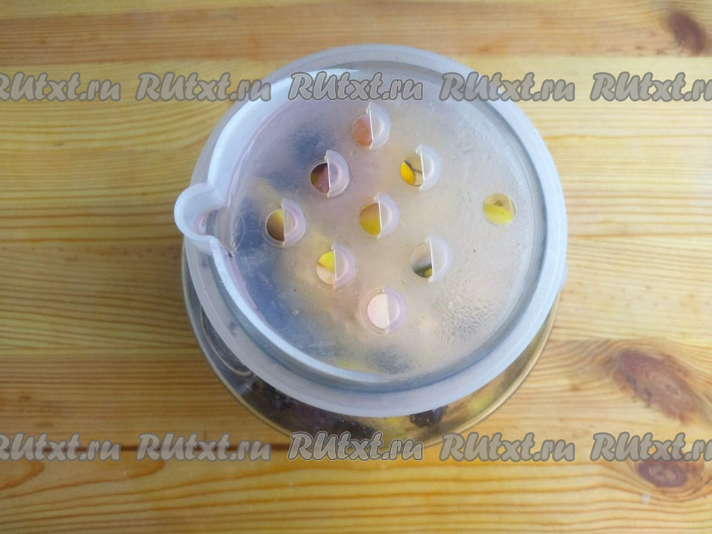 По прошествии 15 минут слить настой из банки в кастрюлю (для того чтобы виноград и яблоки из банки не попали в кастрюлю, удобно вначале на банку надеть крышку с отверстиями, а затем слить настой из банки в кастрюлю).