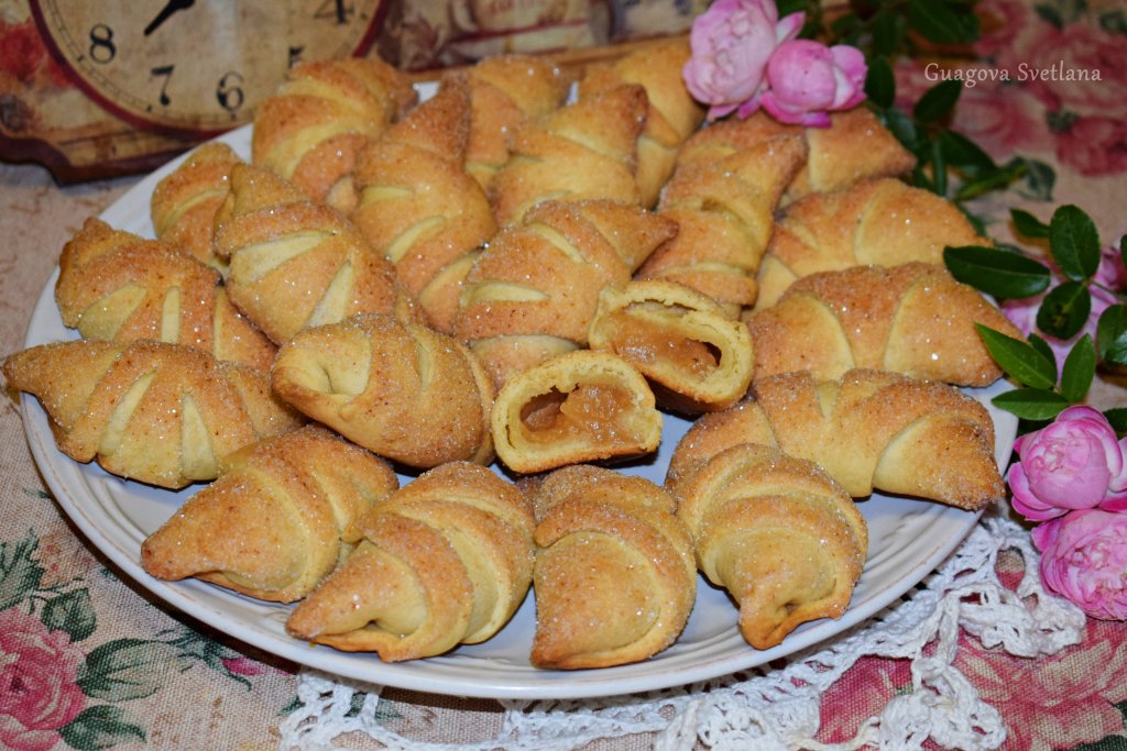 Снимаем рогалики с противня и выкладываем на блюдо для подачи. Даём им остыть и подаём к столу. Нежнейшее, тонкое, рассыпчатое дрожжевое тесто с лёгкой хрустинкой в сочетании с сладко-кислой начинкой из повидла - это очень вкусно!