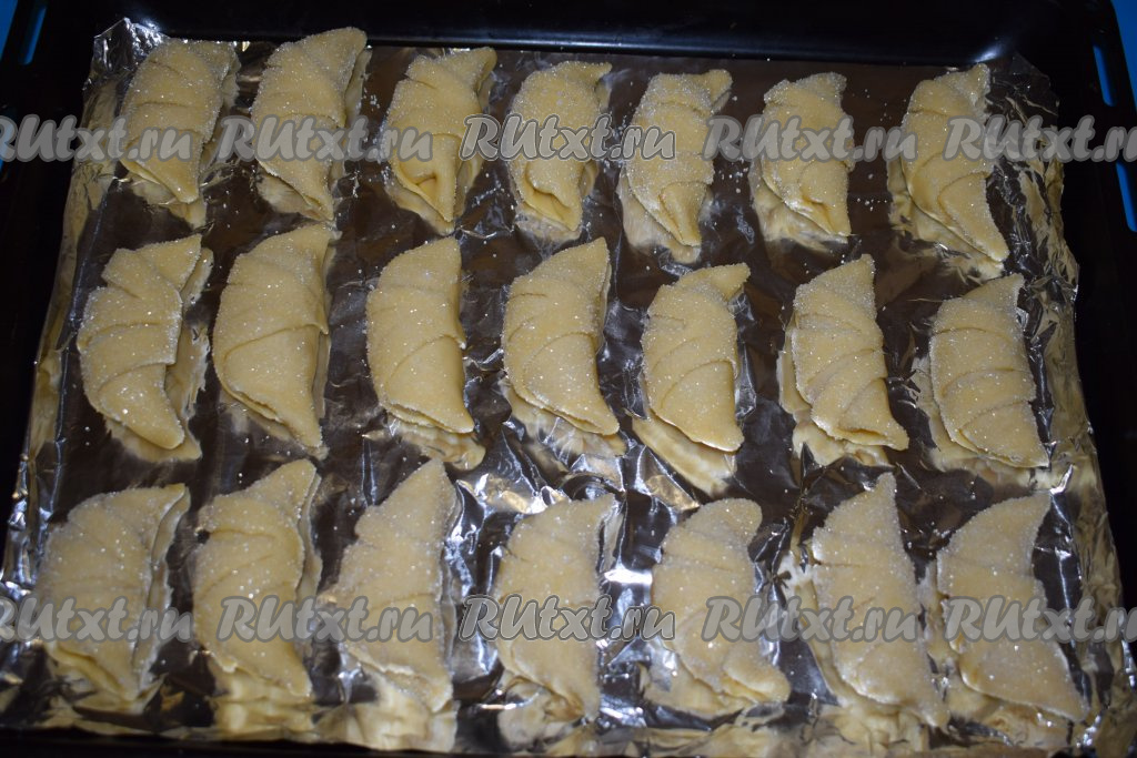 На противень, застеленный фольгой (или пергаментной бумагой), выкладываем обваленные рогалики, соблюдая расстояние, так как в духовке рогалики слегка увеличатся и распухнут.