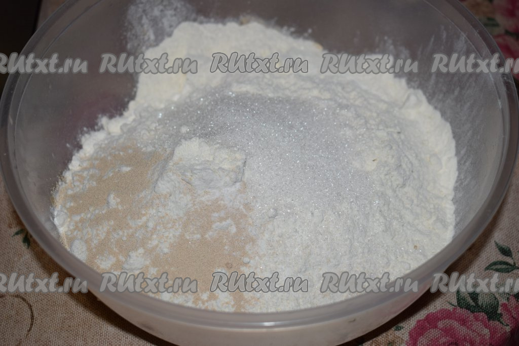 Замесим быстрое дрожжевое тесто, для этого в миску насыпаем 450 грамм муки, добавляем дрожжи и ванилин. Кладём сахар (сахар можно вовсе не класть в тесто, так как, благодаря повидлу и сладкой посыпке, выпечка получается сладкой, вкусной и без добавления сахара, однако именно добавление сахара в тесто позволяет придать рогаликам большую румяность) и соль, перемешиваем мучную смесь.