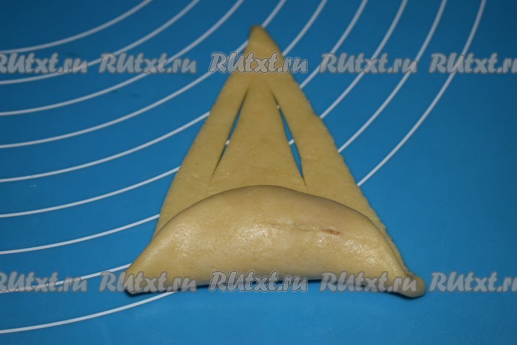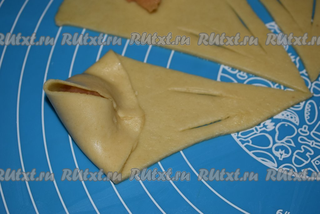 Далее я поделюсь моей методикой сворачивания рогаликов (при таком способе формирования повидло не вытекает и рогалики получаются ровненькими и аккуратными). Защипываем края теста над начинкой, как на фото.