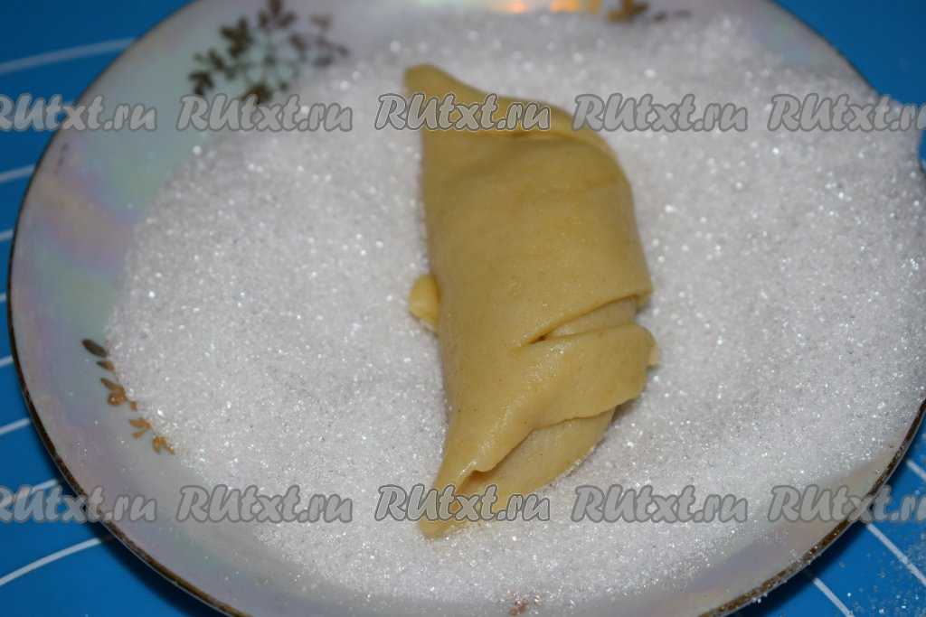 У меня получилось 34 рогалика (32 штуки из раскатанного теста + 2 штуки из обрезков). Далее насыпаем сахар в плоскую тарелку и обваливаем каждый рогалик в сахаре с верхней стороны.