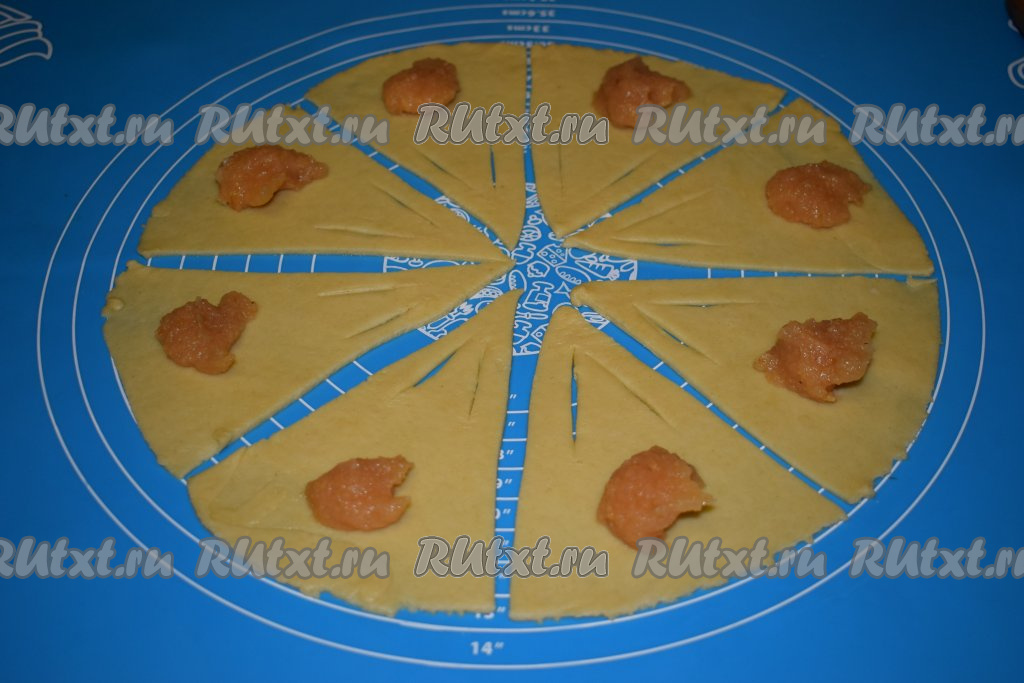 Выкладываем по 1 чайной ложке повидла на широкий край сегмента.