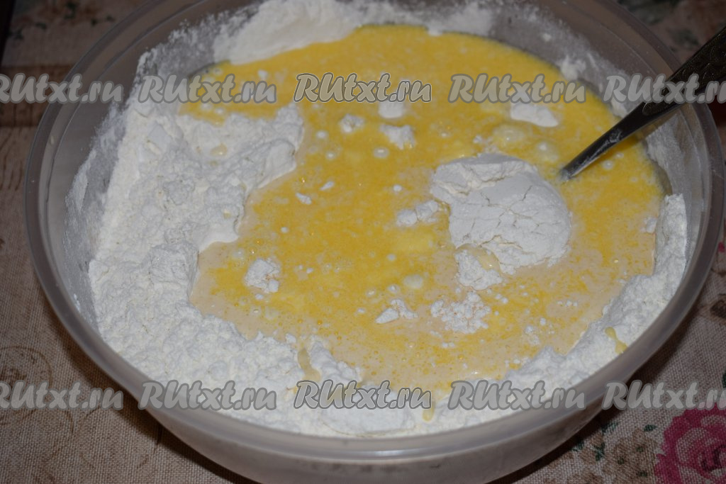 Вливаем молочно-масляную смесь в миску к мучной смеси и начинаем замешивать тесто. В процессе замеса, если понадобится, добавляем постепенно оставшуюся муку.