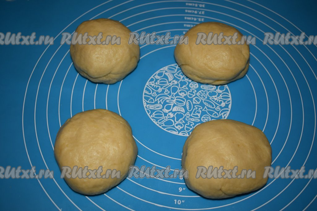 По прошествии времени готовое тесто взвешиваем. У меня вес теста получился 872 грамма, делим его на 4 равных кусочка (у меня каждый кусочек весил по 218 грамм).