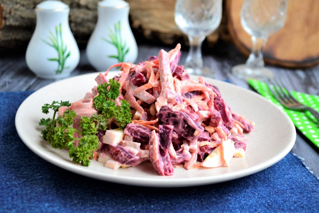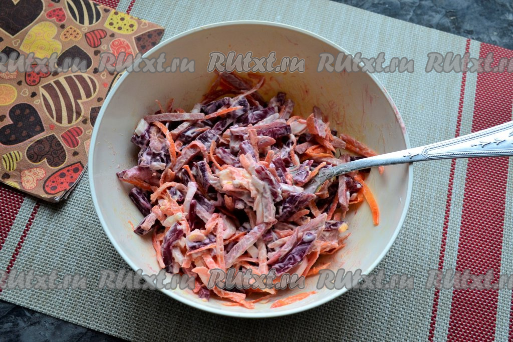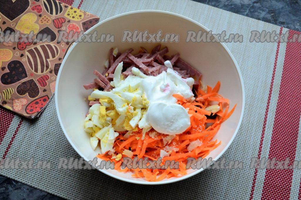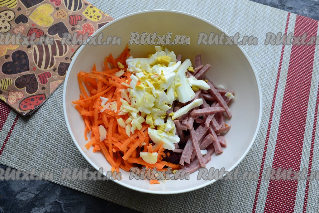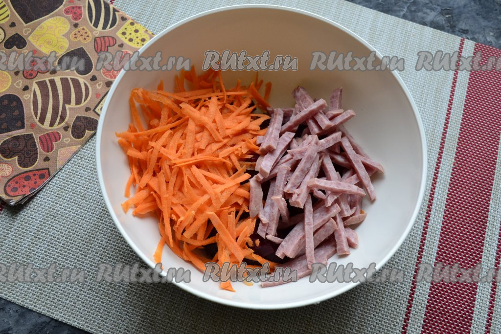 Очистить сырую морковь, а затем натереть на крупной тёрке. Колбасу нарезать брусочками (или соломкой) и вместе с морковкой выложить к свекле.