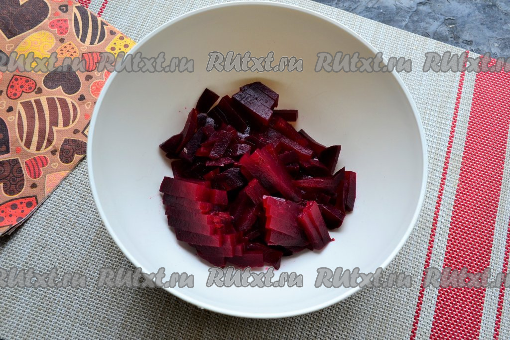 Свеклу предварительно отварить в течение 45-50 минут в кипящей воде, остудить и очистить. Яйца также отварить вкрутую (варим, примерно, 8-10 минут с момента закипания), остудить и почистить. Нарезать свеклу брусочками.