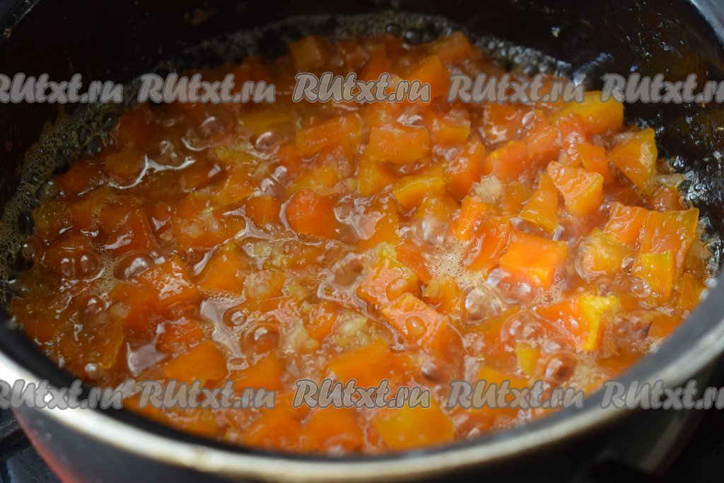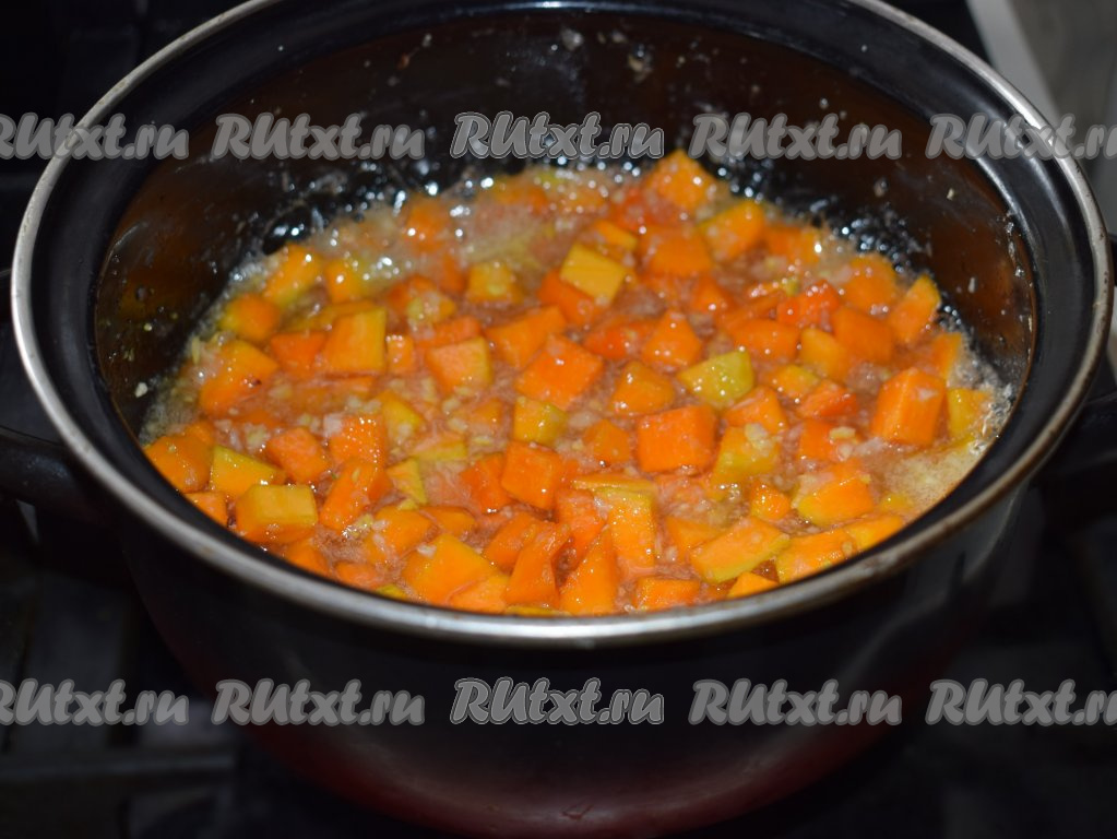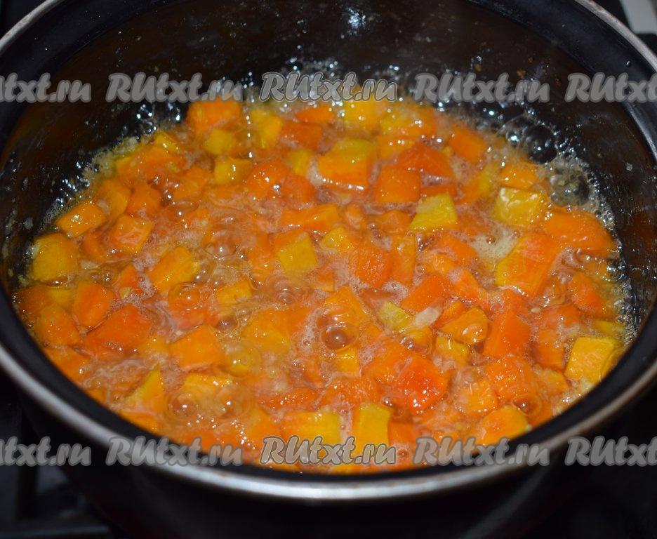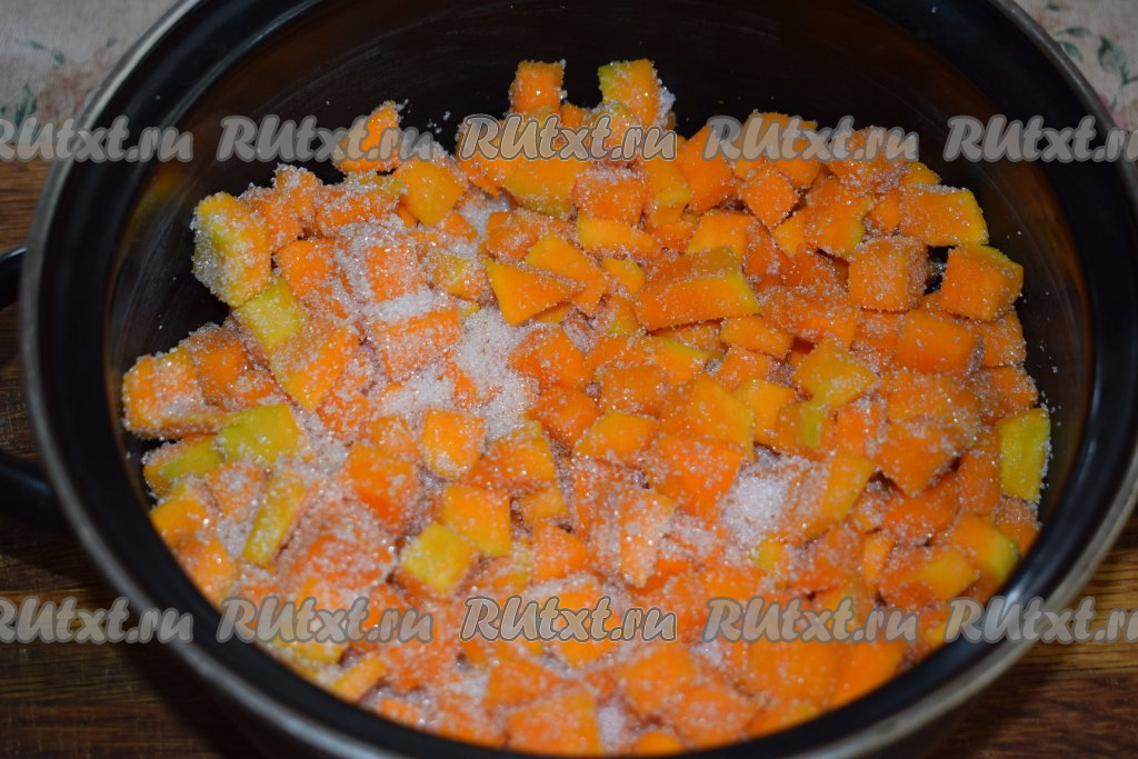 Отправляем тыкву в кастрюлю (или миску), в которой будем варить варенье, и засыпаем сахаром. Оставляем тыкву с сахаром на 2-3 часа, чтобы она пустила сок.