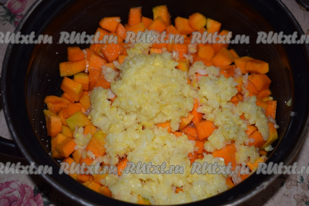 К тыкве, которая уже успела пустить сок, добавляем измельчённые лимон и имбирь, перемешиваем и отправляем кастрюлю на огонь.