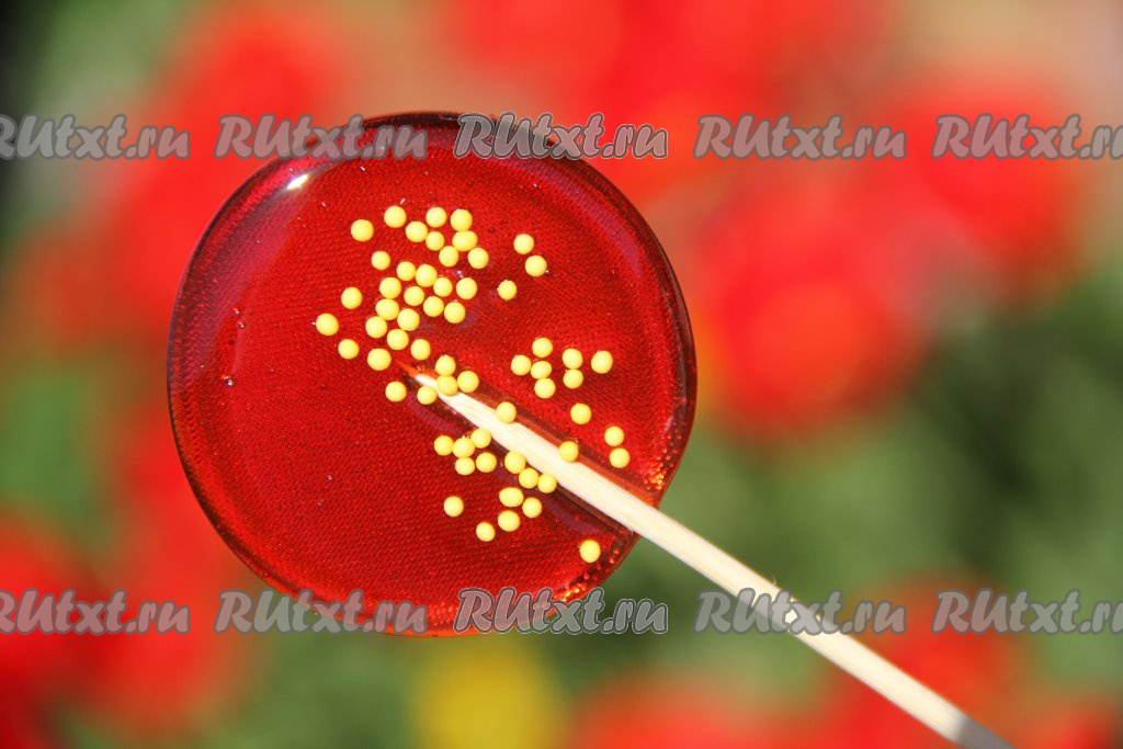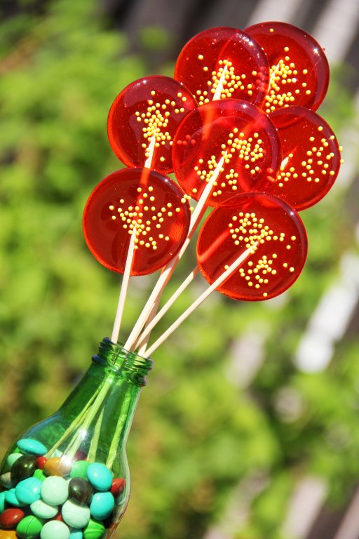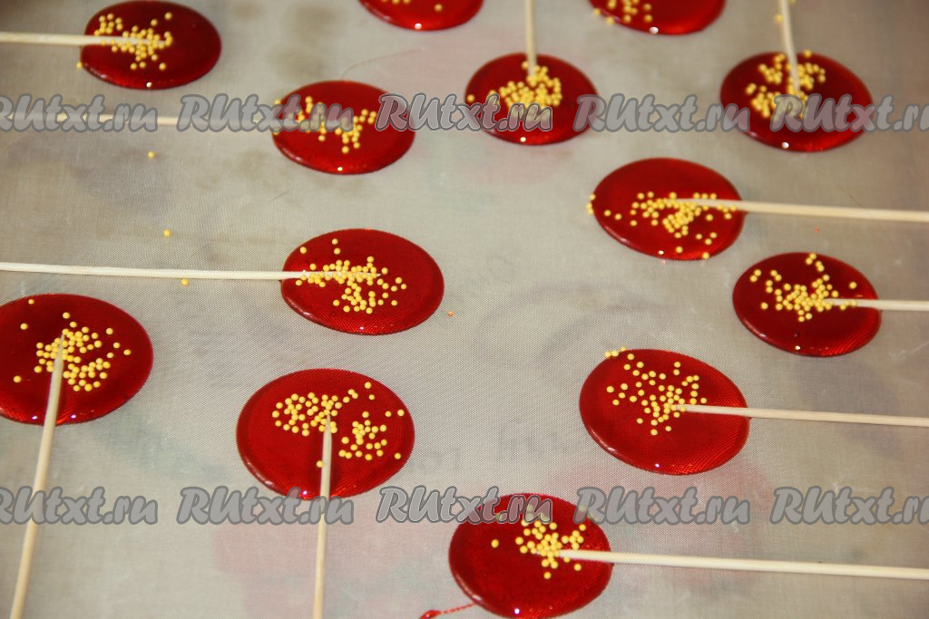 Набрать в чайную ложку карамель и вылить её на силиконовый (или тефлоновый) коврик в виде кружочка. Сразу вставить деревянную шпажку и посыпать цветной посыпкой. Таким образом, используя всю карамель, сваренную с добавлением глюкозного сиропа, сформировать все леденцы на палочках. Оставить леденцы до полного застывания (минут на 20).