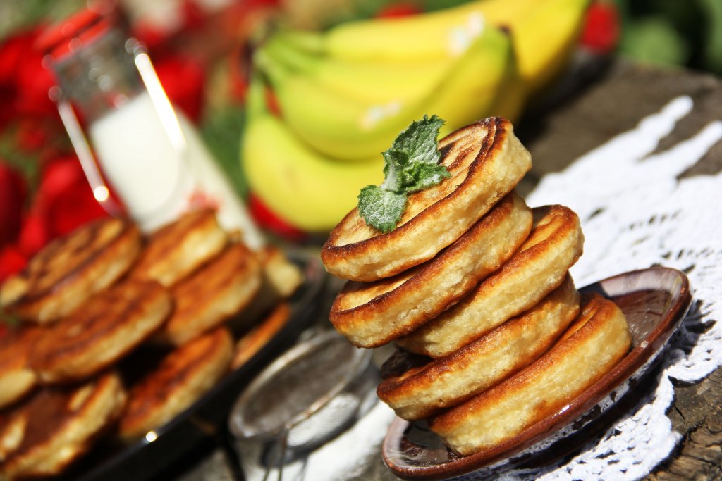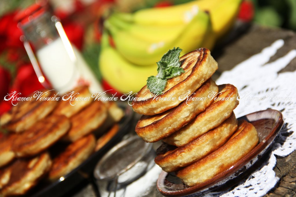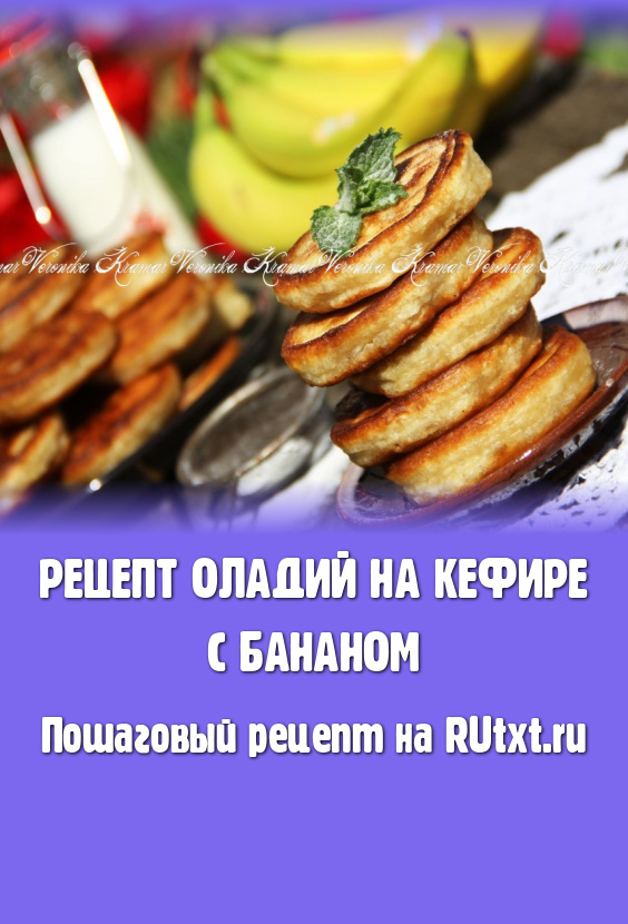 На завтрак или в качестве перекуса можно приготовить ароматные, сытные оладьи из теста, замешанного на кефире, в которое добавляются кусочки банана. В этом рецепте яйца в состав теста не входят. Оладушки получаются аппетитными, вкусными и пышными. При остывании они не опадают, хотя лучше подавать их столу тёплыми, дополнив, например, сметаной или вареньем.