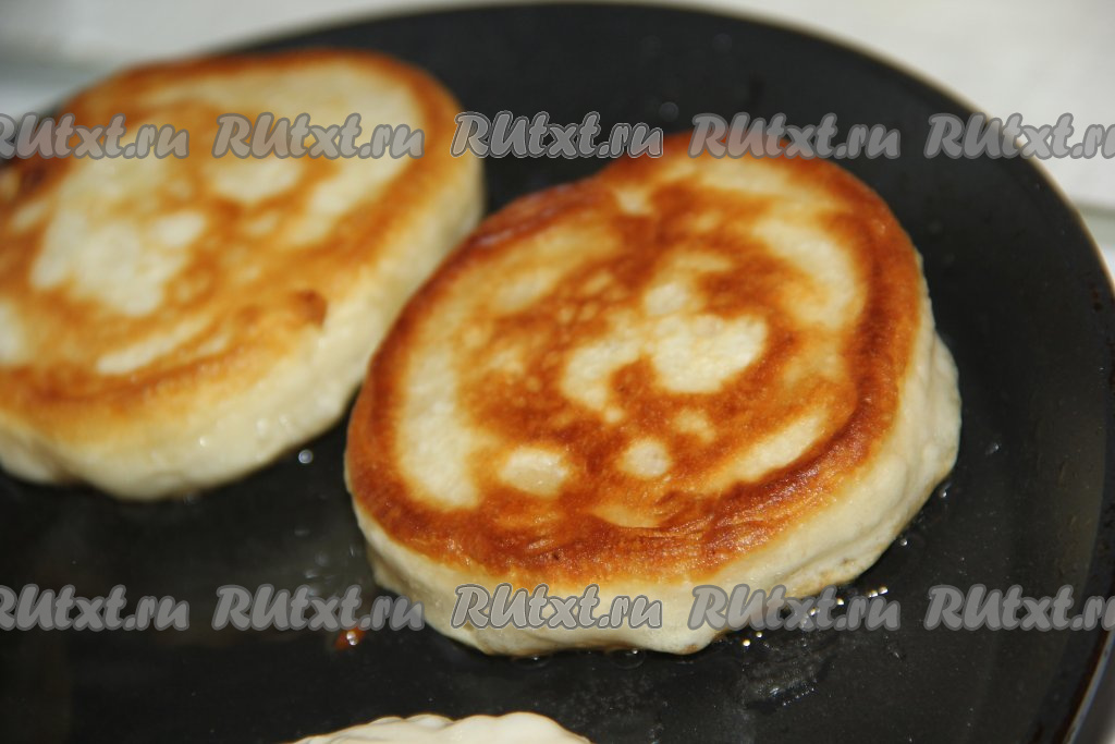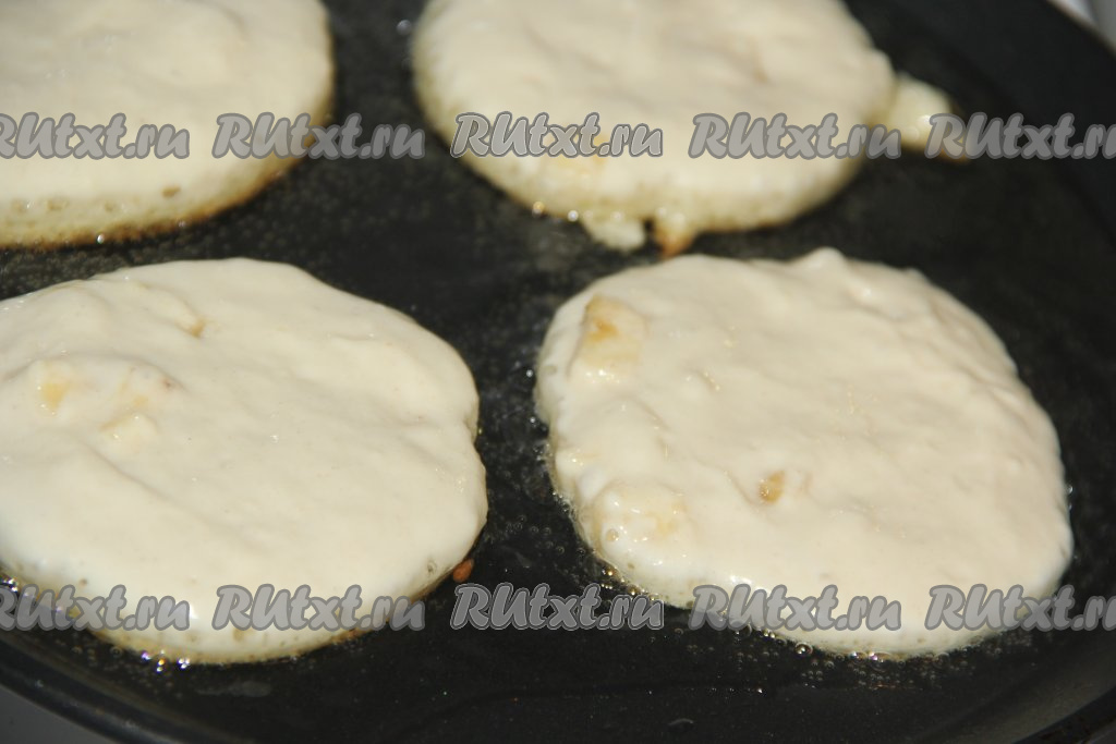 Жарить оладушки на среднем огне с двух сторон до золотистого цвета. Затем переложить на тарелку, а на той же сковороде аналогично пожарить оладьи из оставшегося теста.