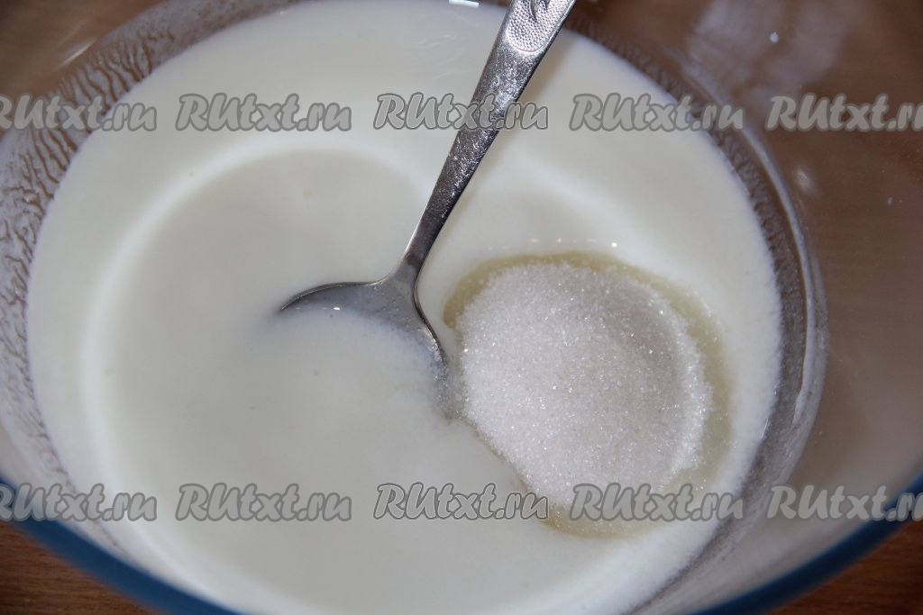 Затем в кефир, смешанный с содой, добавить сахар и перемешать.
