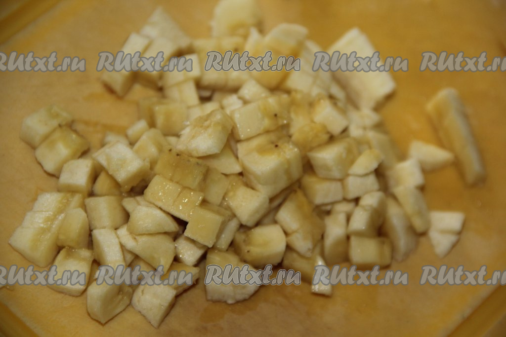 Банан очистить и нарезать на средние кубики (не нужно мять банан вилкой, нужны именно кусочки).