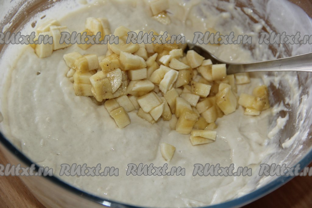 Перемешать тесто с бананом, оно получится в меру густым, по консистенции будет напоминать сметану средней густоты.