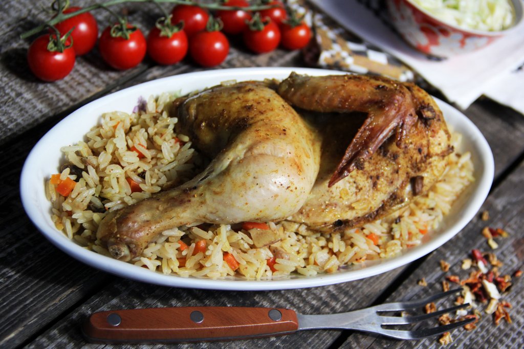 Переложить рассыпчатый рис с сочной курицей на тарелку и подать к столу.