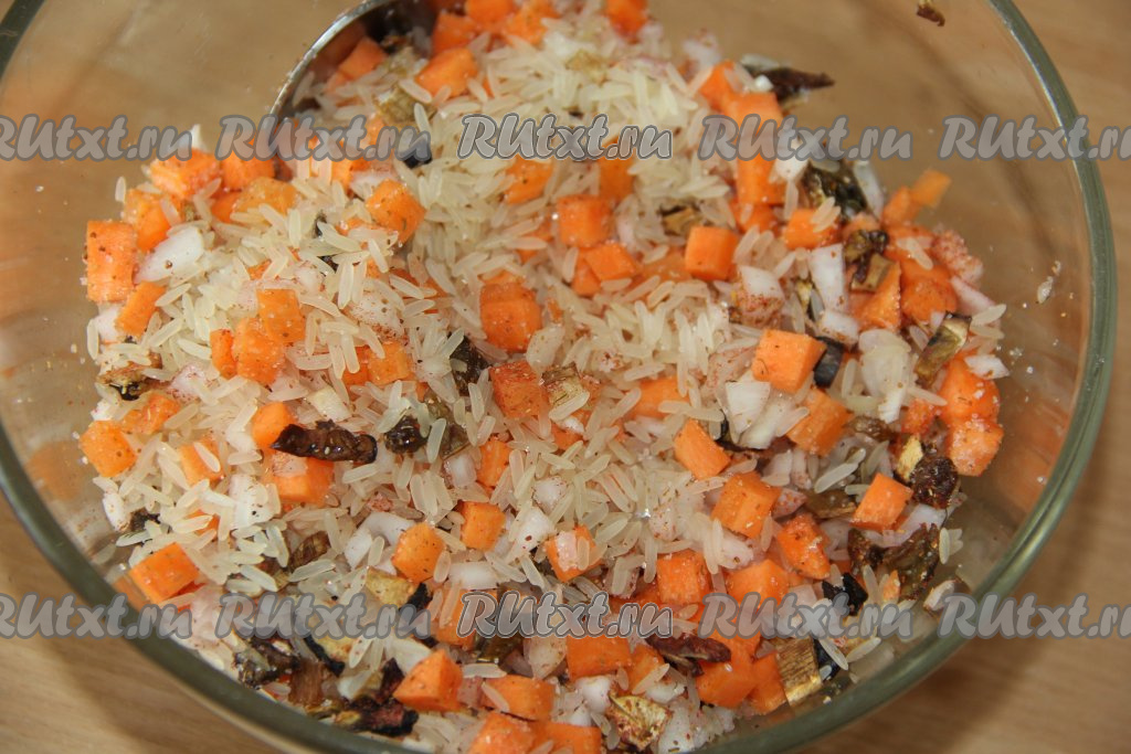 К овощам с рисом добавить соль и специи (я добавила по вкусу специи для риса).