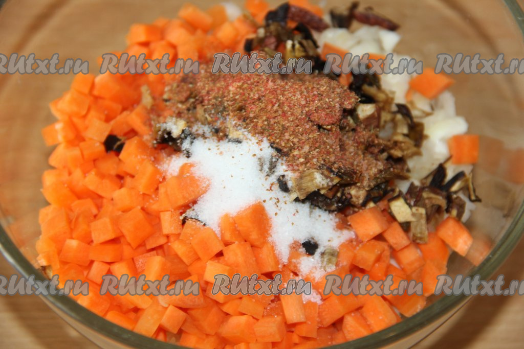 Куриное мясо вымыть. Я взяла половинку тушки, не разрезая её на части (можно, конечно, разрезать курицу на порционные кусочки). Курочку посолить со всех сторон и замариновать любым способом (я обмазала специями для птицы со всех сторон) и оставить пропитаться солью и специями минут на 30. Лук и морковь почистить. Морковку нарезать на кубики, а луковицу нарезать достаточно мелко. Сушёные грибы промыть под горячей водой, а затем измельчить ножницами. Если у вас нет грибов, то приготовить это блюдо можно и без них.