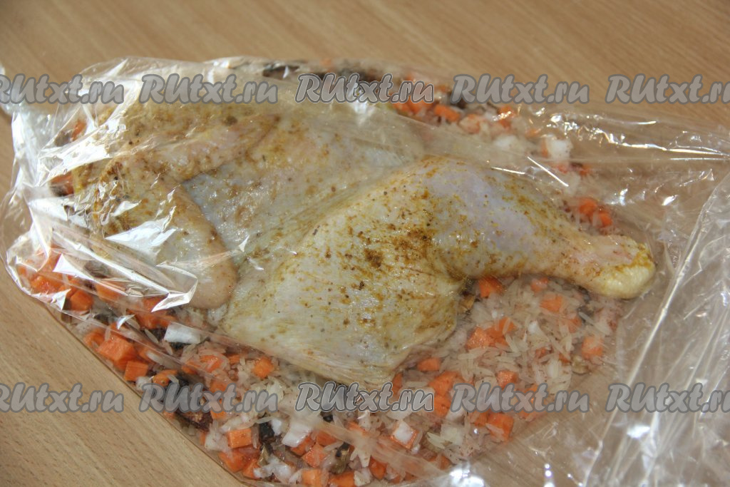 Поверх риса и овощей выложить половинку курицы (или части курицы). Переложить рукав для запекания на противень. Влить воду в рукав и завязать его со второй стороны.