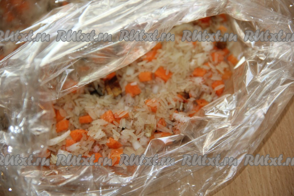 Выложить рисово-овощную массу в рукав для запекания, завязанный с одной стороны.