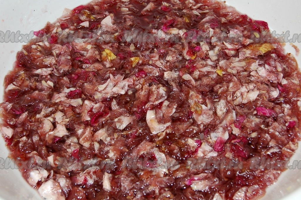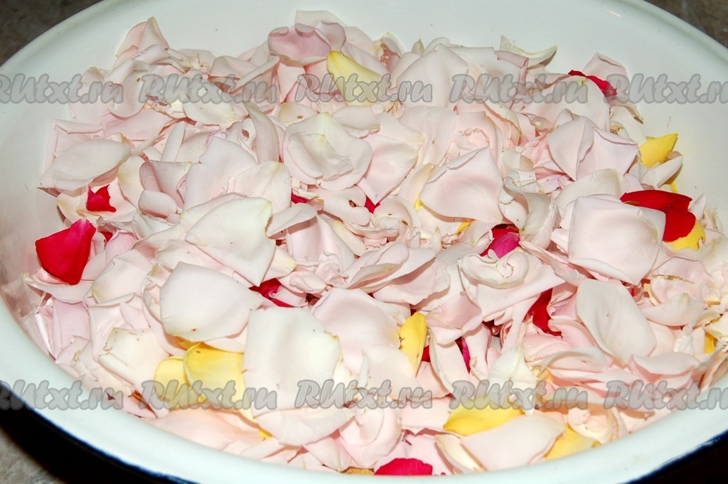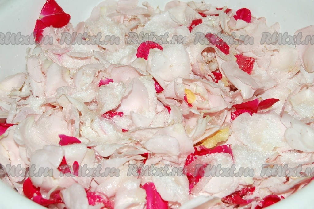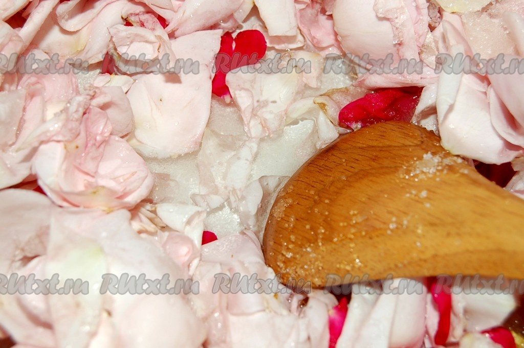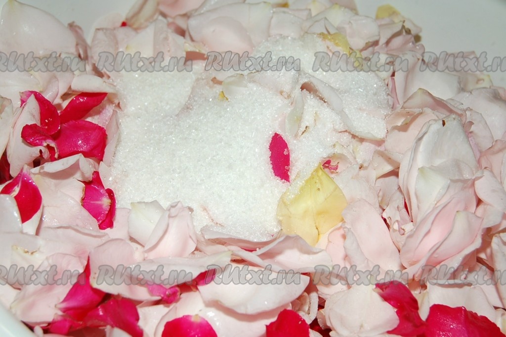 Затем собрать лепестки роз в таз, в котором будет вариться варенье и пересыпать их половиной количества сахара. Оставить на 6 часов, сверху прикрыть полотенцем.